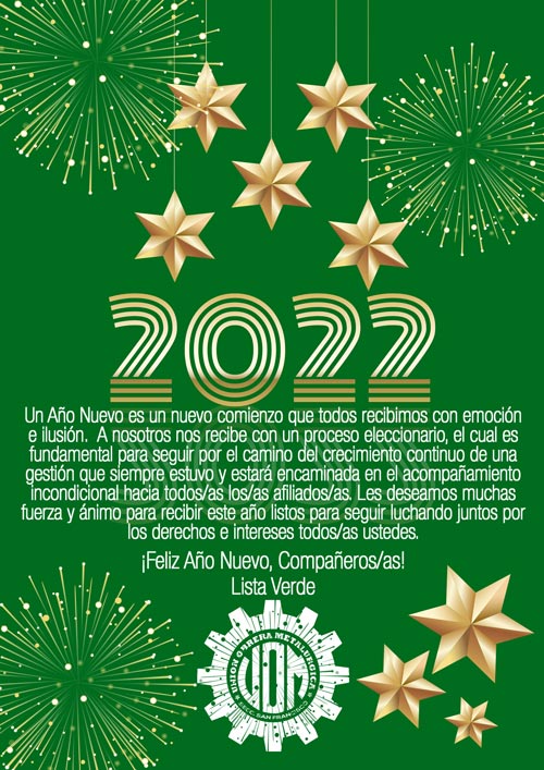 Un Año Nuevo es un nuevo comienzo que todos recibimos con emoción e ilusión. A nosotros nos recibe con un proceso eleccionario, el cual es fundamental para seguir por el camino del crecimiento continuo de una gestión que siempre estuvo y estará encaminada en el acompañamiento incondicional hacia todos\as los\as afiliados\as. Les deseamos muchas fuerza y ánimo para recibir este año listos para seguir luchando juntos por los derechos e intereses todos\as ustedes.