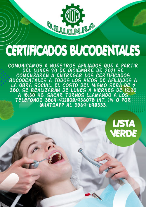 Comunicamos a nuestros\as afiliados\as que a partir del lunes 20 de diciembre de 2021 se comenzaran a entregar los certificados bucodentales a todos los\as hijos\as de afiliados\as a la Obra Social. El costo del mismo será de $ 250. Se realizarán de lunes a viernes de 12:30 a 15:30 hs. Sacar turnos llamando a los teléfonos 3564-421808\436075 interno 114 o por WhatsApp al 3564-648333.