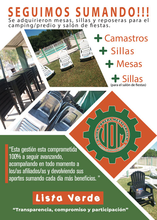 Informamos a nuestros\as afiliados\as que debido a la gran demanda y concurrencia al predio\camping en la actual temporada 2021\2022 hemos adquirido más mesas, sillas y camastros. También se compraron sillas para el salón de fiestas.
