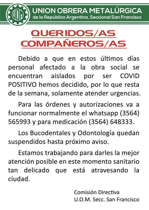 Les informamos que debido a que en estos últimos días personal afectado a la obra social se encuentran aislados por ser COVID POSITIVO hemos decidido, por lo que resta de la semana, solamente atender urgencias.