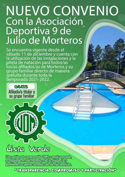 Comunicamos a todos\as nuestros\as afiliados\as que después de unas semanas de negociación logramos acordar con la Asociación Deportiva 9 de Julio de Morteros un nuevo convenio de beneficio que se suma a nuestra amplia lista. El mismo ya se encuentra vigente desde el sábado 11 de diciembre y cuenta con la utilización de las instalaciones y la pileta de natación para todos\as los\as afiliados\as de Morteros y su grupo familiar directo de manera gratuita durante toda la temporada 2021-2022.