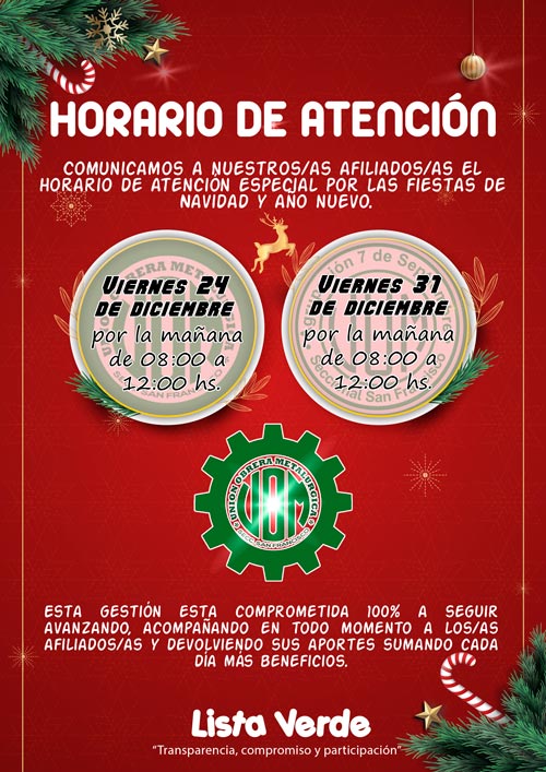 Comunicamos a nuestros\as afiliados\as el horario de atención especial en la Seccional por las fiestas de Navidad y año nuevo: