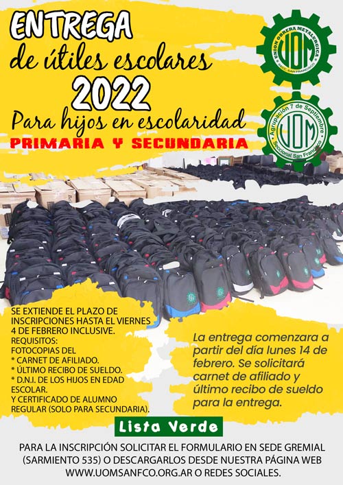 Les recordamos que a partir del día lunes 14 de febrero comenzará la entrega de los kits escolares (Se solicitará carnet de afiliado y último recibo de sueldo para la entrega) y que se extendió el plazo de inscripciones hasta el viernes 4 de febrero inclusive.