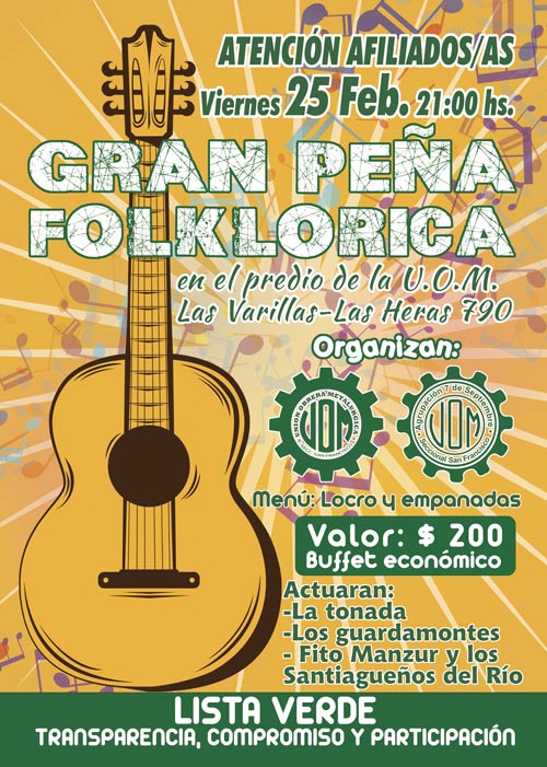 La Unión Obrera Metalúrgica Seccional San francisco junto a la agrupación 7 de septiembre organiza para el viernes 25 de febrero una peña folklórica en el predio de la U.O.M. Las Varillas cito en calle Las Heras 790.