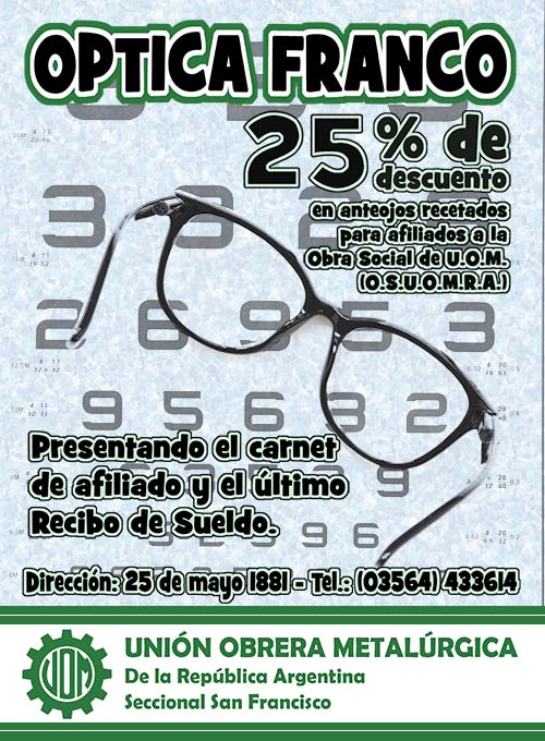 Comunicamos a todos los afiliados a la Obra Social de la Unión Obrera Metalúrgica de la República Argentina Seccional San Francisco que se ha firmado un convenio con la Óptica Franco, la cual a partir de la fecha ya está vigente dicho convenio que consta en descuento del 25% en Anteojos Recetados.