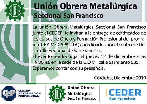 La Unión Obrera Metalúrgica Seccional San Francisco junto al CEDER, te invitan a la entrega de certificados de los cursos de Oficio y Formación Profesional del programa "CBA ME CAPACITA", coordinados por el centro de Desarrollo Regional de San Francisco.