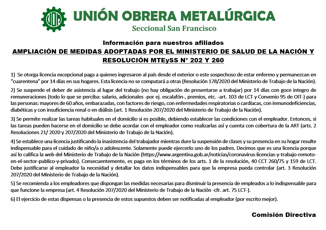 AMPLIACIÓN DE MEDIDAS ADOPTADAS POR EL MINISTERIO DE SALUD DE LA NACIÓN Y RESOLUCIÓN MTEySS N° 202 Y 260