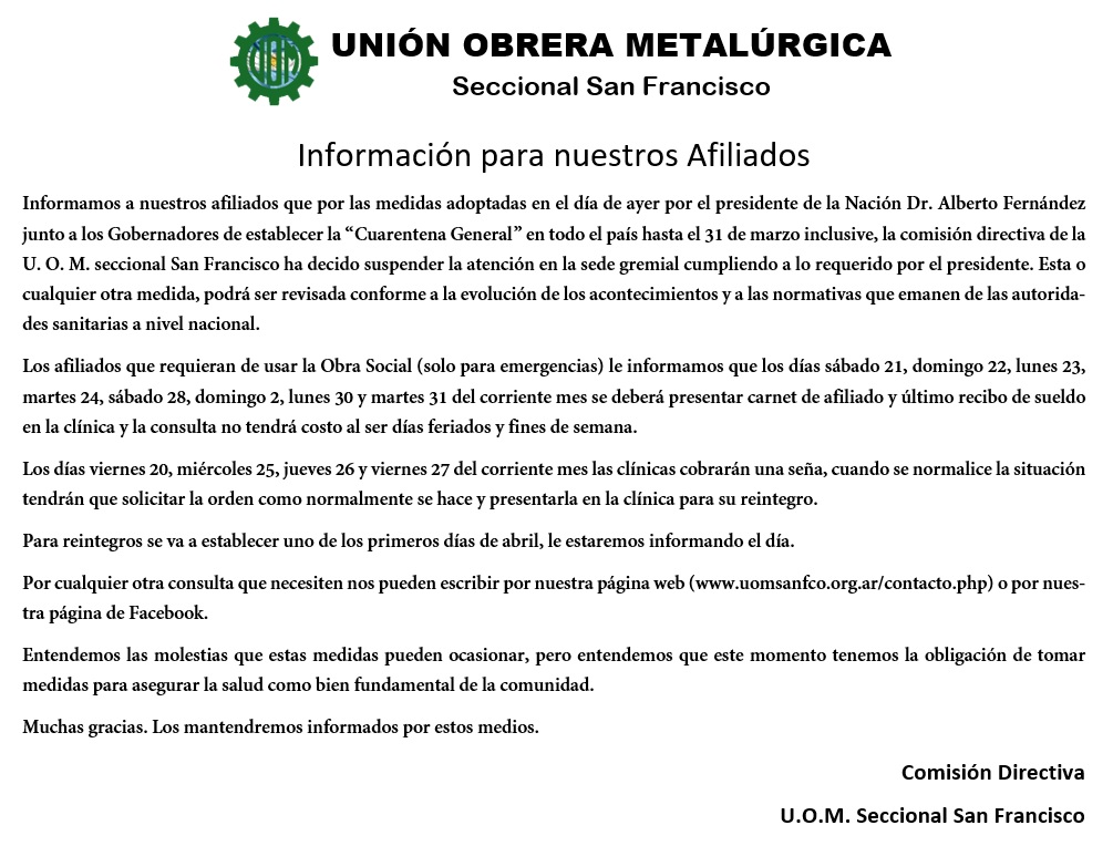 Informamos a nuestros afiliados que por las medidas adoptadas en el día de ayer por el presidente de la Nación Dr. Alberto Fernández junto a los Gobernadores de establecer la "Cuarentena General" en todo el país hasta el 31 de marzo inclusive, la comisión directiva de la U.O.M. seccional San Francisco ha decido suspender la atención en la sede gremial cumpliendo a lo requerido por el presidente. Esta o cualquier otra medida, podrá ser revisada conforme a la evolución de los acontecimientos y a las normativas que emanen de las autoridades sanitarias a nivel nacional.