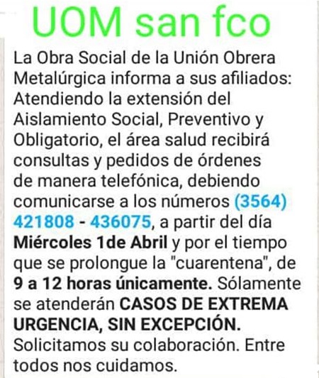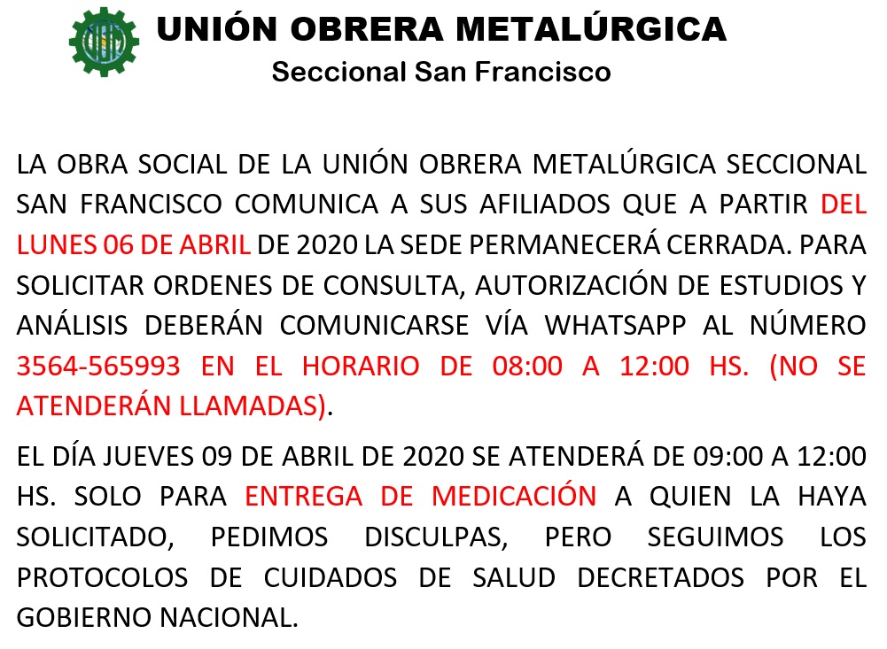 LA OBRA SOCIAL DE LA UNIÓN OBRERA METALÚRGICA SECCIONAL SAN FRANCISCO COMUNICA A SUS AFILIADOS QUE A PARTIR DEL LUNES 06 DE ABRIL DE 2020 LA SEDE PERMANECERÁ CERRADA. PARA SOLICITAR ORDENES DE CONSULTA, AUTORIZACIÓN DE ESTUDIOS Y ANÁLISIS DEBERÁN COMUNICARSE VÍA WHATSAPP AL NÚMERO 3564-565993 EN EL HORARIO DE 08:00 A 12:00 HS. (NO SE ATENDERÁN LLAMADAS).