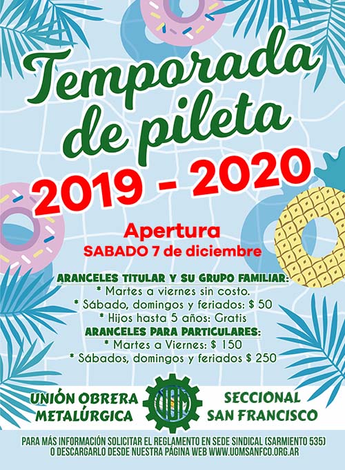 Comunicamos a nuestros afiliados que el sábado 07 de diciembre de 2019 será la fecha de apertura de la temporada de pileta y se extenderá hasta el domingo 1 de marzo de 2020. El ingreso será prioritario para los afiliados activos, jubilados y su grupo familiar directo.