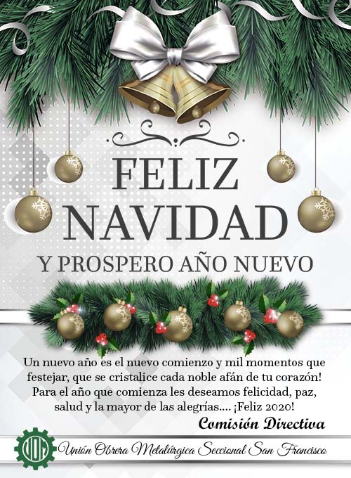 La Comisión Directiva de la Unión Obrera Metalúrgica Seccional San Francisco en estas fiestas saluda a todos sus afiliados y familia. ¡Brindemos juntos por un 2020 de trabajo, paz, salud y prosperidad!